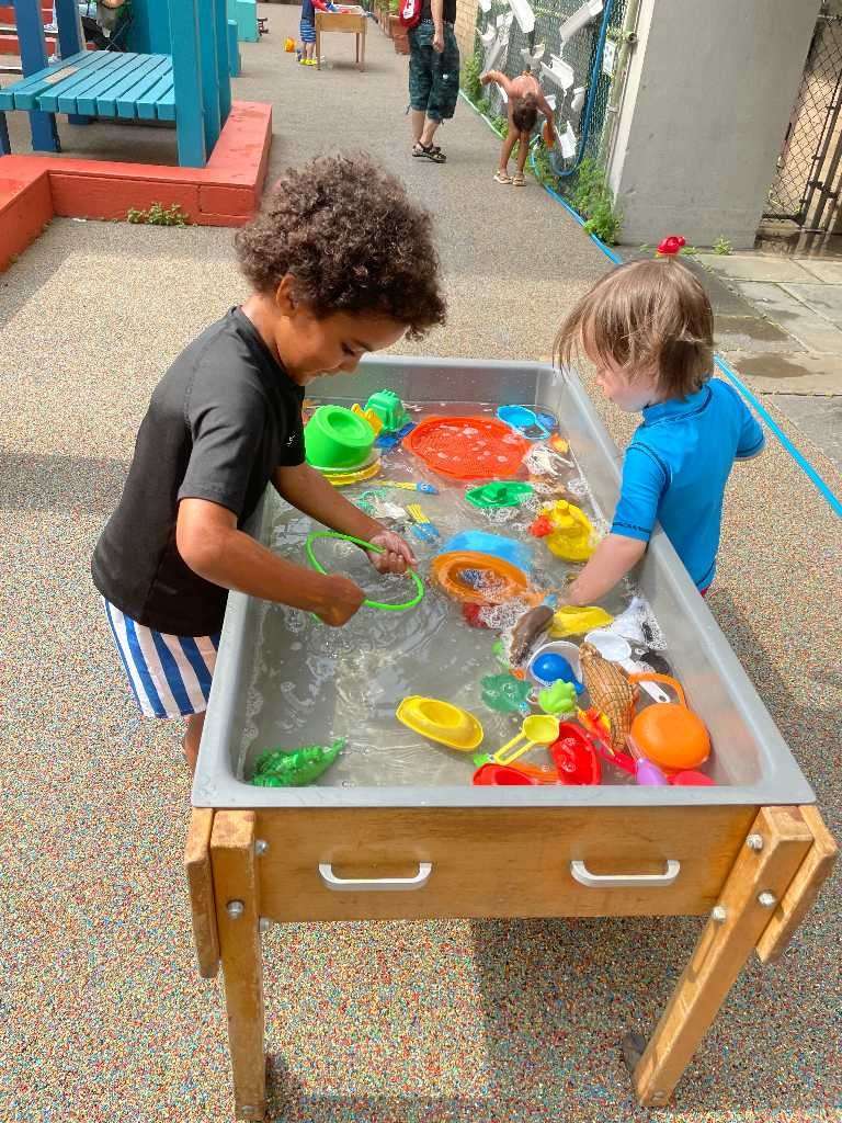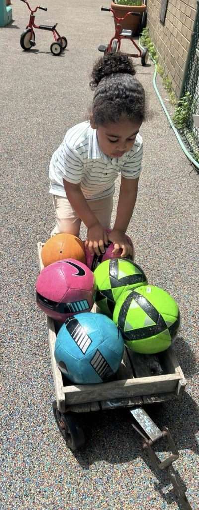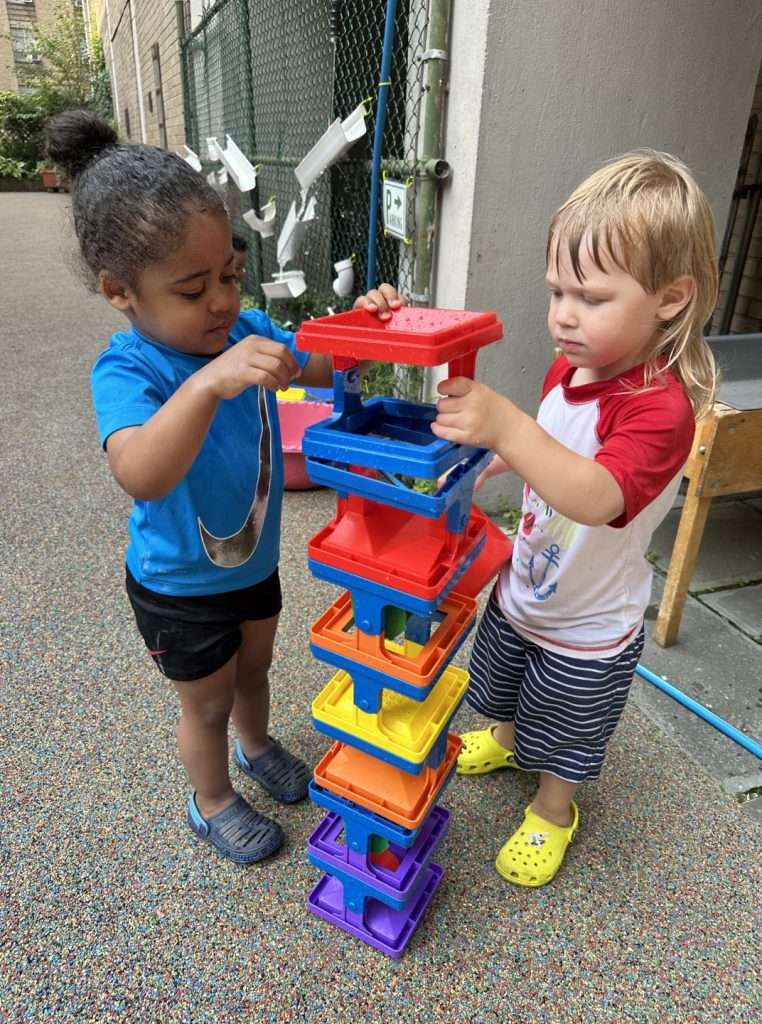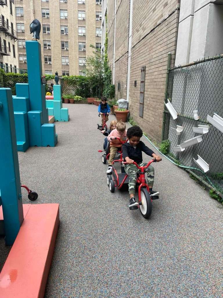 By 10:45ish, both Explorers and Pathfinders are heading to our rooftop playground one flight up from the school. Weather permitting, children spend a bit over an hour on the playground.