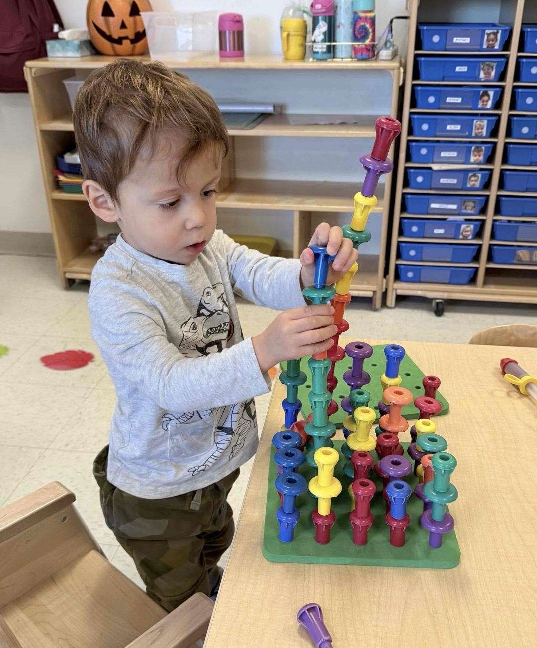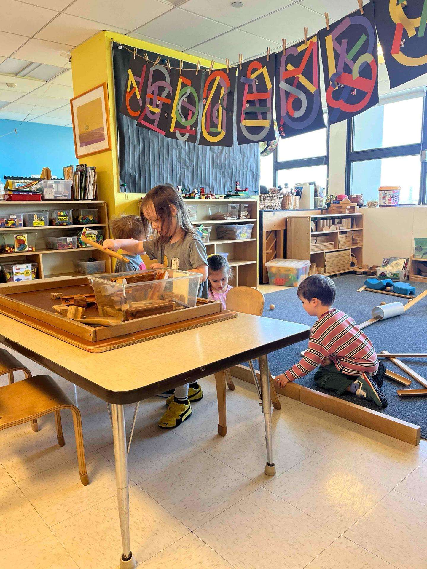 Arrival 8:30 – 9:45: Children are greeted individually by teachers, then they wash their hands before starting their day. For the next hour or so, children make choices between dramatic play, reading books with a teacher, block building, working with vehicles, manipulatives, writing tools, and other open ended materials. Teachers help children initiate and sustain play with their peers, modeling kind language. Children often work with teachers on individual and small group art or science projects during this time.